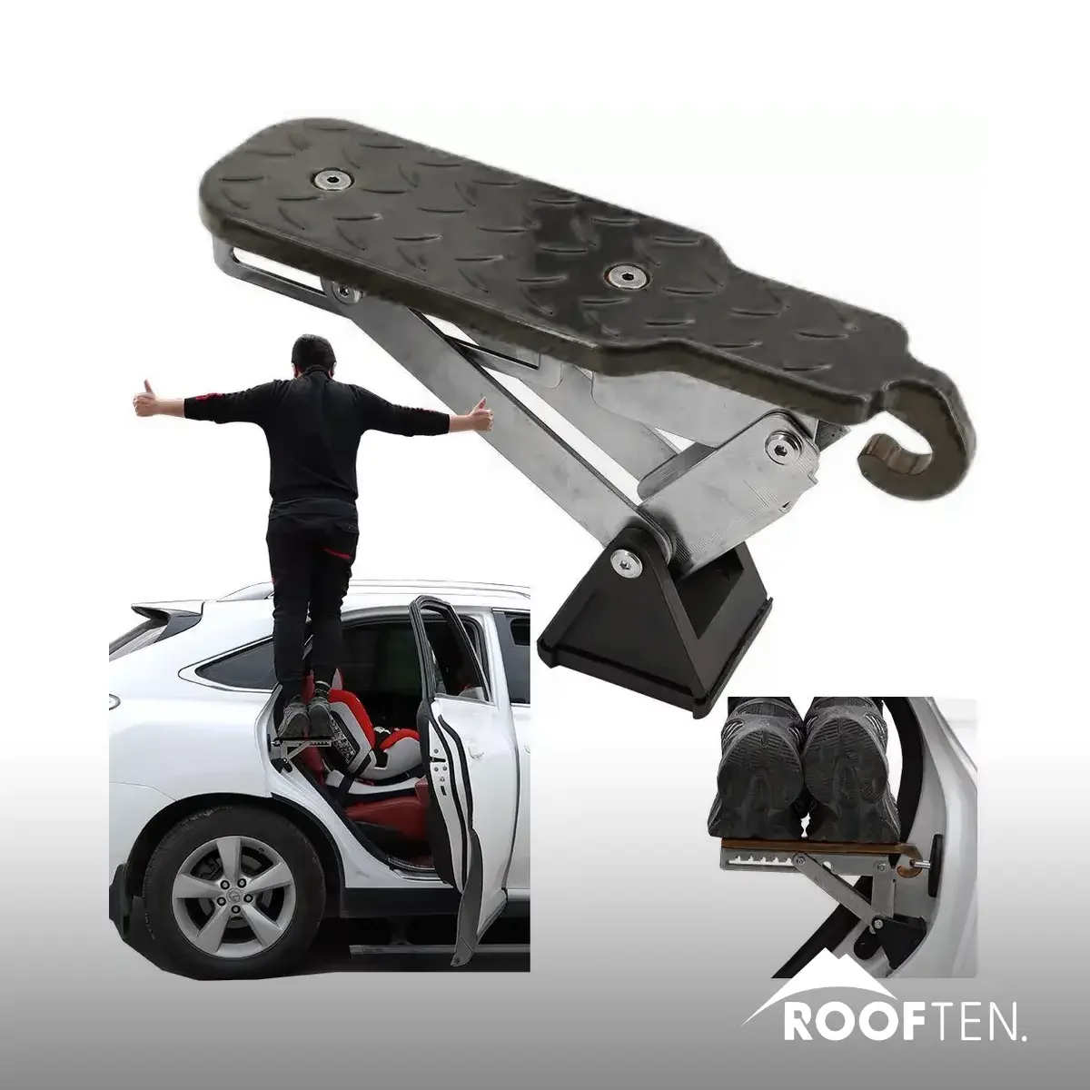 La escalera de pedales con soporte para ambos pies es un accesorio práctico y esencial para quienes necesitan acceso fácil al techo de su vehículo. Fabricada en aleación de aluminio, es ligera y resistente, con un peso de solo 0,85 kg y una capacidad máxima de carga de 400 lbs (181 kg). Con dimensiones de 245 x 68 x 78 mm, esta escalera es compacta y plegable, lo que permite guardarla de manera cómoda en la guantera o en el compartimento de neumáticos de repuesto. Su diseño plegable hace que sea portátil y fácil de instalar: simplemente abre cualquiera de las puertas de tu automóvil o camión, engancha el pestillo de la puerta.